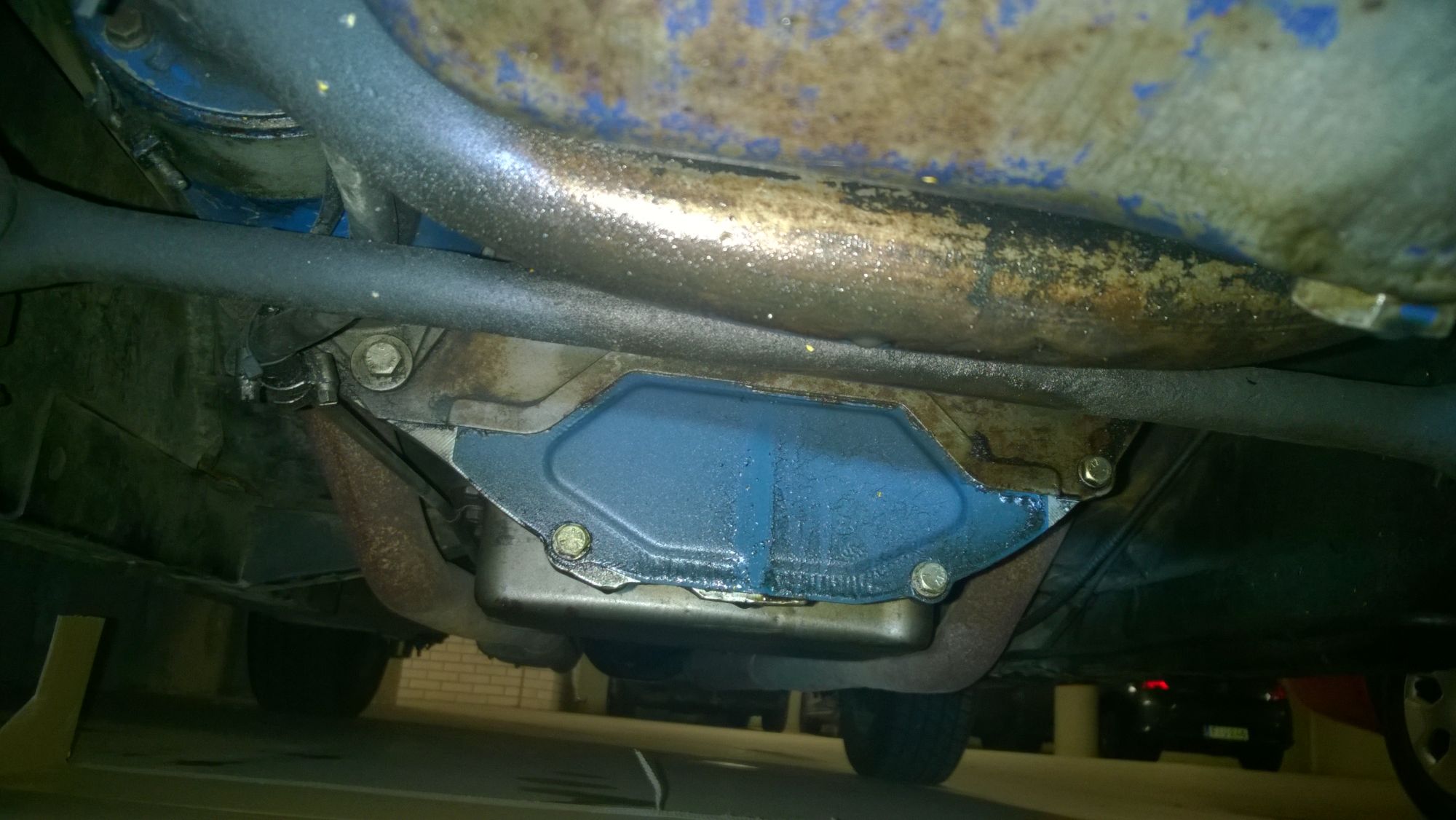 Mulla on 66 fastbackki mihin on varmaan vuosien saatossa vaihdettu 302 kone ja siihen on pikkuhiljaa ilmaantunut koneen takaosaan pieni öljyvuoto. Kävin iltasella ottamassa kuvan auton moottorin alaosasta mistä näkyy öljyn tippumiskohta. Eli öljy valuu kuvassa olevaa sinistä pintaa pitkin keskeltä levyä.