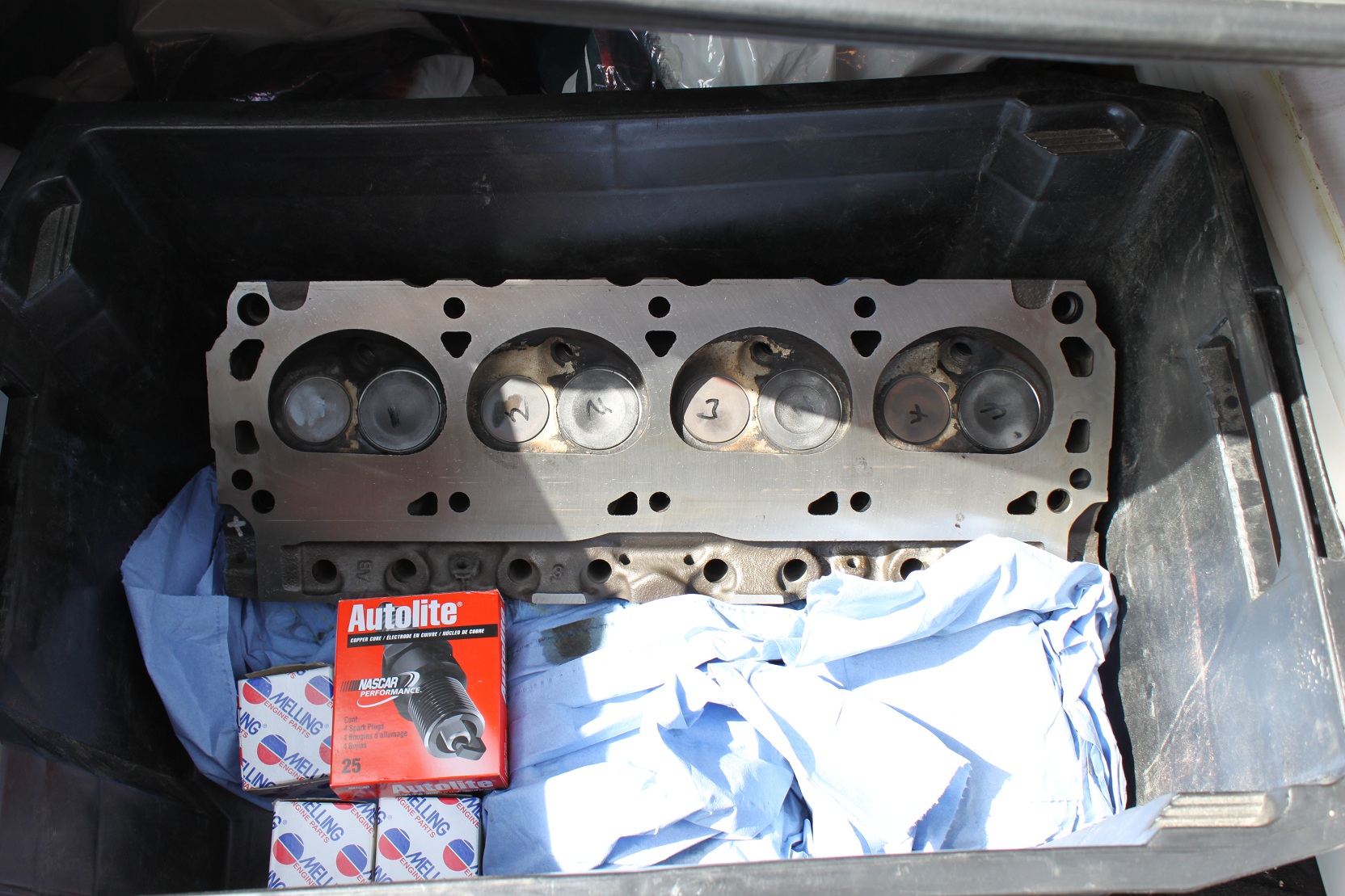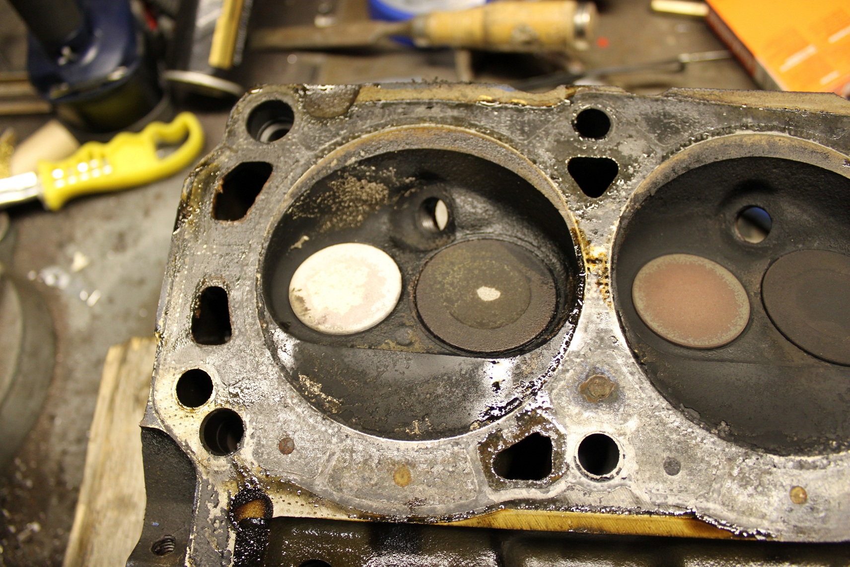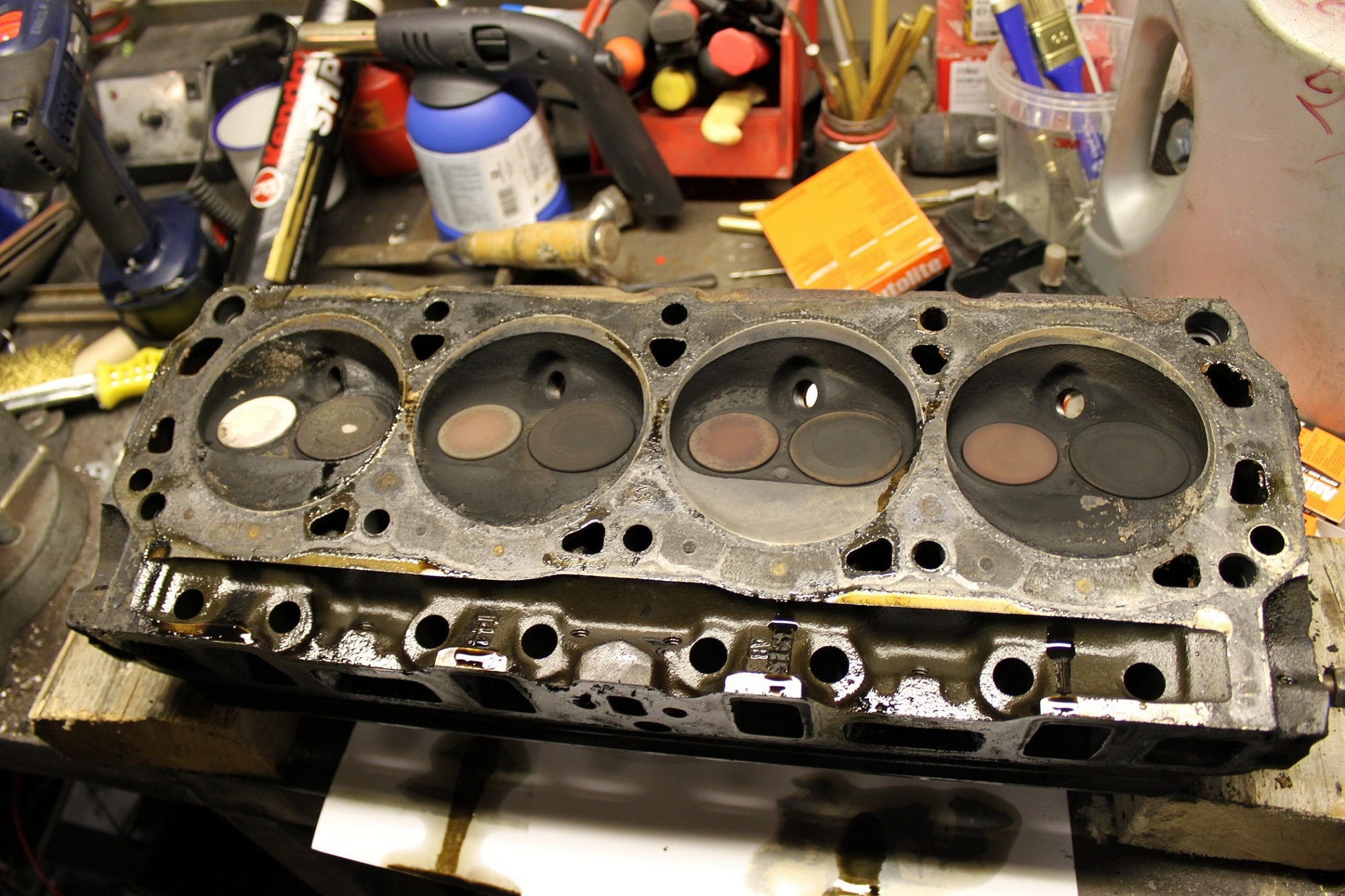 Kansien vasemman puoleinen pakoventtiili paistaa kirkkaana silmään. Vettä on mennyt lävitse jonkin verran. Kansien plaanaus, ehkä puristuspainetesti ja venttiilien läppäys eli onkohan ventiilin istukkaan hionta se virallinen termi? Läppäyksen jokainen koneistamo tuntee ja taitaa maksaa 1-2 e per venttiili riippuen koneistamosta, eli ei välttämättä säästön paikka, senkun laittaa koneistamon tekemään.