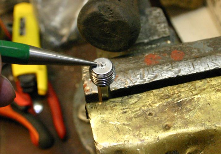 Koetin sitten porata sitä reikää tuohon tulppaan (0,5 mm) ja eihän se onnistunut. Poraus pienessä pylväskoneessa, jossa ei ollut kierroksia kuin 2500 rpm. Dremeliin ei ollut telinettä ja pora meni poikki kun olin kituuttanut 10 minuuttia reikää. Porasin lopulta tulppaan reiän 1 mm:n poralla ja pienensin reiän sitten tuurnalla: