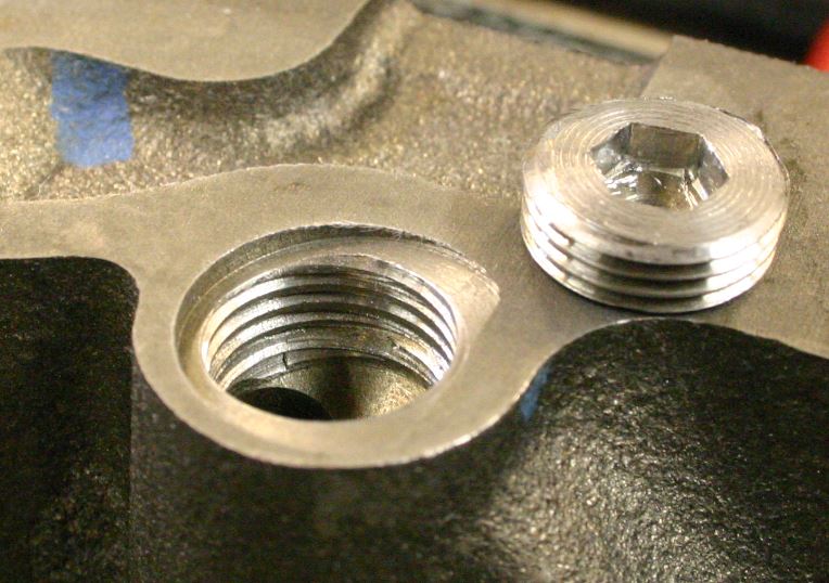 Omassa lohkossani oli jo kierteytetty takapuolella olevat kolme tulppaa (tehtaan jäljiltä?), mutta kierre oli ilmeisesti NPSF (National Pipe Straight Fuel)? Tuohon kierteeseen ei nimittäin vanha ja uusi tulppa mennyt kuin pari kierrosta.