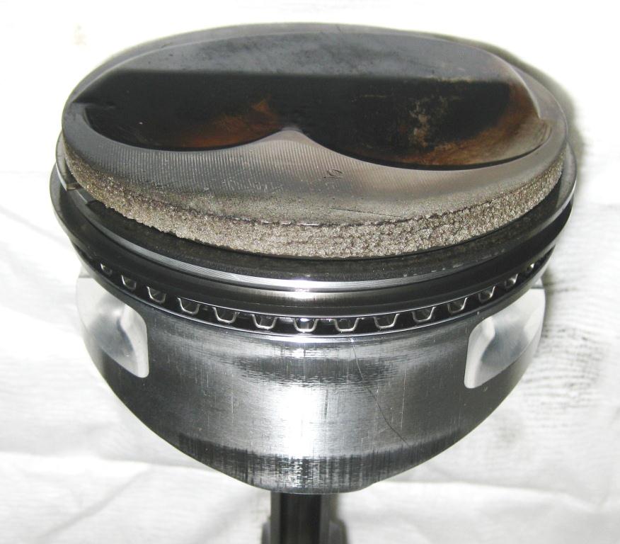 Detonoinut mäntä, huomaa kuinka vähän on ollut tilaa männän ja kannen välissä kun kannen tasohionta kuvio näkyy männän päällä.