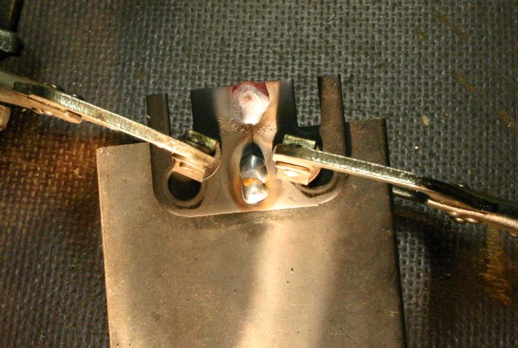 Kuva guideplate esisovituksesta. Plate halkaistu ja keinujen päät saa säädettyä sivusuunnassa kohdilleen: