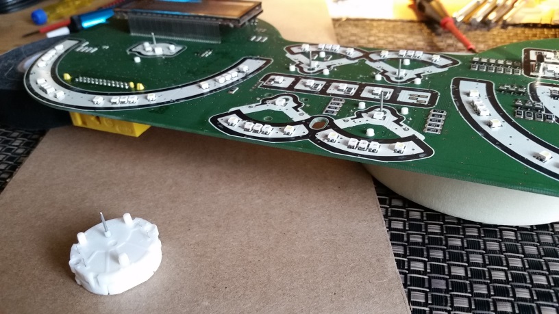 Mittariston poisotto oli helppoa, ratti ala-asentoon, kojelaudan maskilevy irti, neljä 7mm ruuvia pois ja liitin irti. Mittariston purku oli myös helppoa, klipseillä ala ja yläosat irti, varovaisesti neulat pois ja tausta irti. Kolvilla sitten varovaisesti ja maltilla moottorien pinnit sulatella ja kyllähän ne sieltä loppujen lopuksi irtoaa. Uudet kiinni ja tinanapit päihin. Uuteen faceen kohdistin pienillä merkeillä raakasäädöt neulojen nolla-asentoa varten.