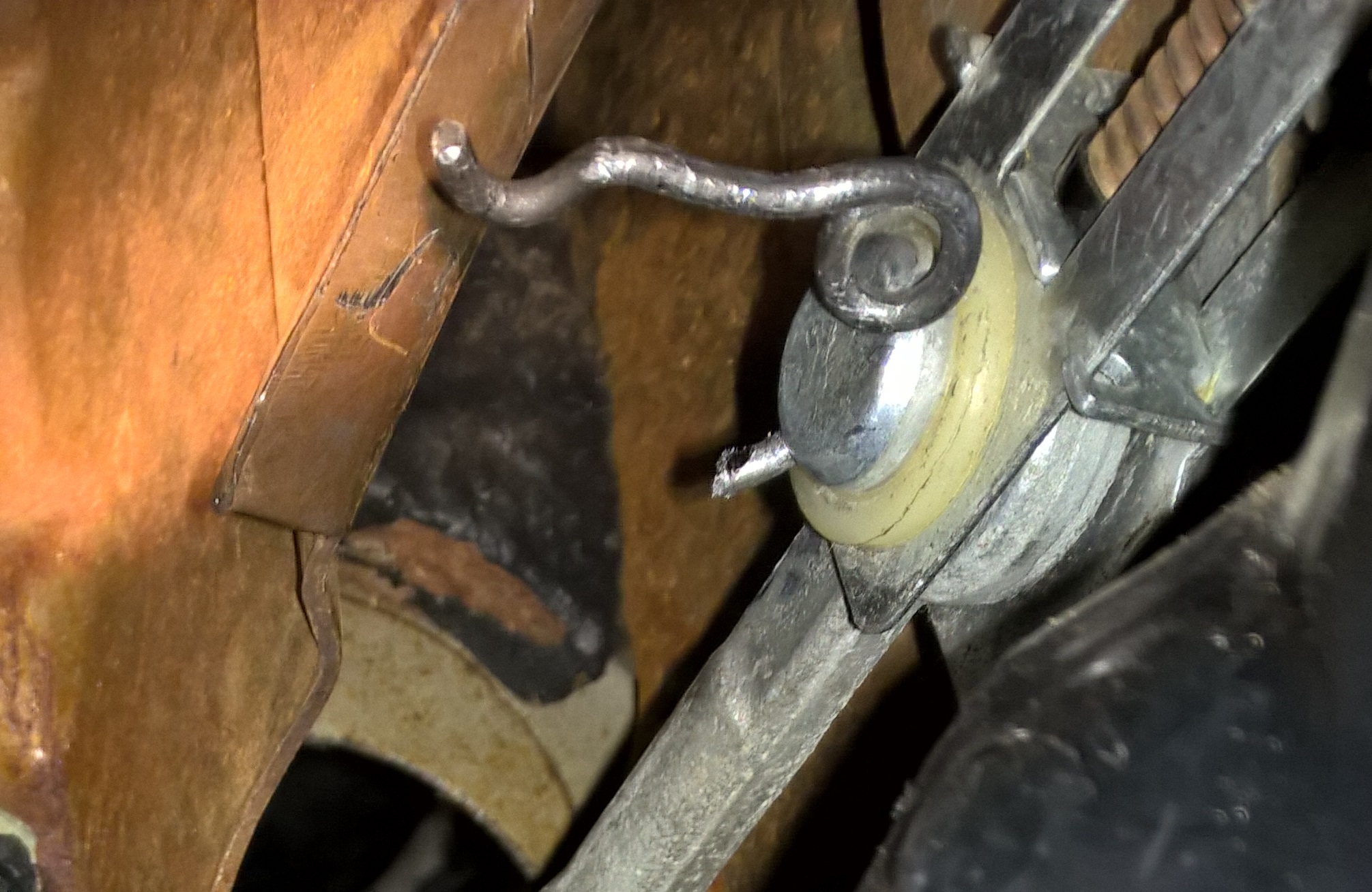Vanhan irroitus ei sitten mennytkään ihan putkeen. Olisko yhdystangon pää lyttääntynyt tai edellinen mekaanikko jättänyt miinoja - ei vaan tanko suostunut hellittämään otettaan sylinteristä. Ei edes voimalla. Niinpä aloin irrottaa tankoa polkimen päästä, jossa ilmeisestikin yksi miinoista oli, eli sokka oli väännelty mutkille niin ettei se tullut pois paikaltaan. Oma niska ei taipunut että olis voinut edes yrittää katkaista sokka ja pojan katkaisuyritys ei mennyt ihan kohdalleen, eikä niillä työkaluilla olis voinutkaan. Alla kuvat niin kuin sokka on parin tunnin kiroilun jälkeen ja miltä sen pitäisi näyttää ilman aiempaa väkivaltaa.