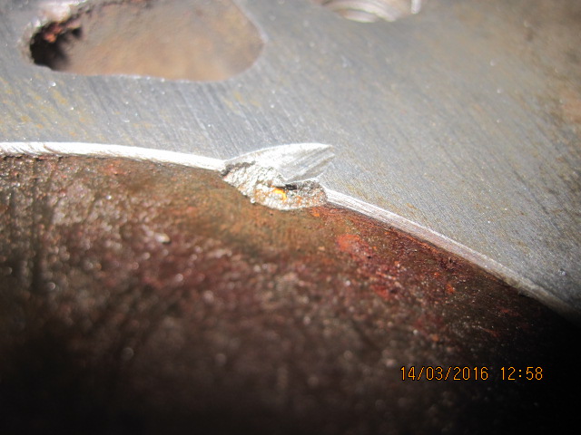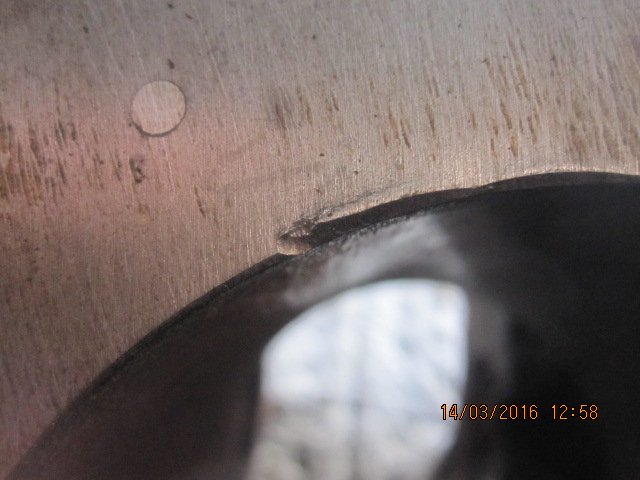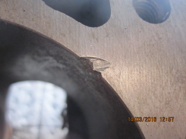 Eli tuommosesta tapauksesta kyse! Lovi on syvimmillään noin 1 millin ja leveydeltään max. melkein 4,5mm, siis säteen suuntaan eli reijästä ulospäin! Tavallinen kansipahvi ei oikein peitä lovea, joten varmasti vuotaisi!