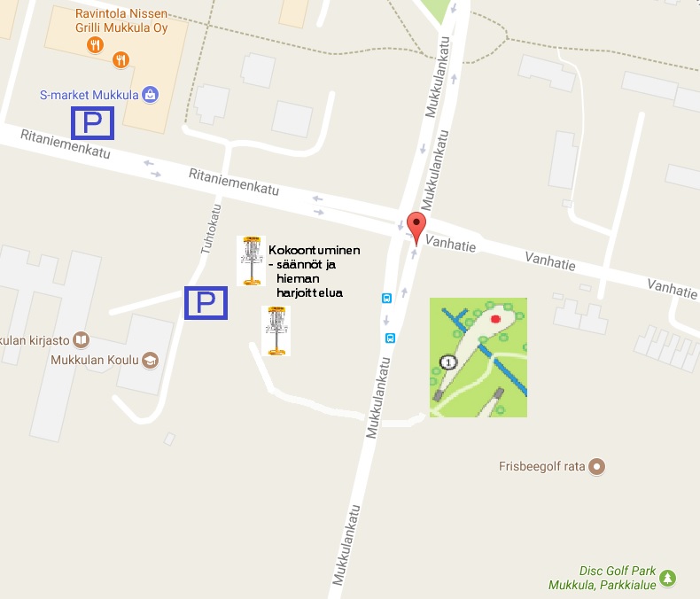 Kokoonnutaan harjoittelupaikalle, kartta ohessa. Minulla on lainata kiekkoja, joten riittää että tulette mukaan reippaalla ulkoilumielellä ja mukavissa ulkoiluvaatteissa. Pikku reppu tai laukku on myös kätevä mukana, jossa kulkevat kiekot sekä mahdollisesti mukaanne ottamat sään mukaiset varusteet, kuten lippikset, aurinkolasit, juomat ja eväät.