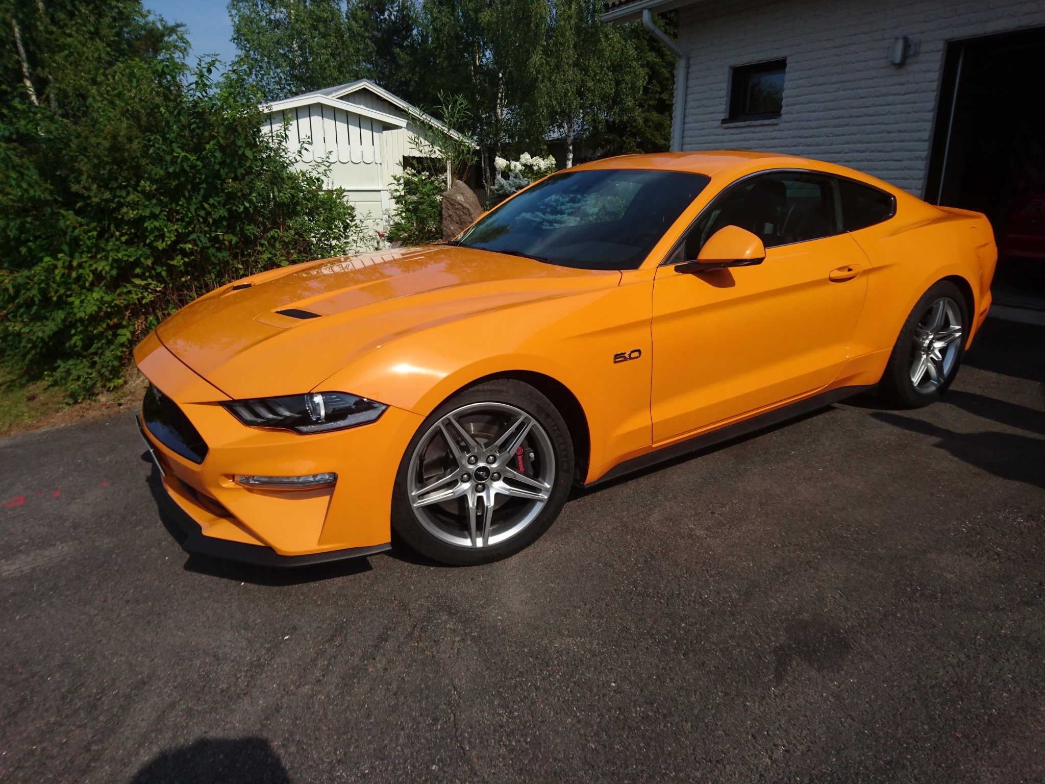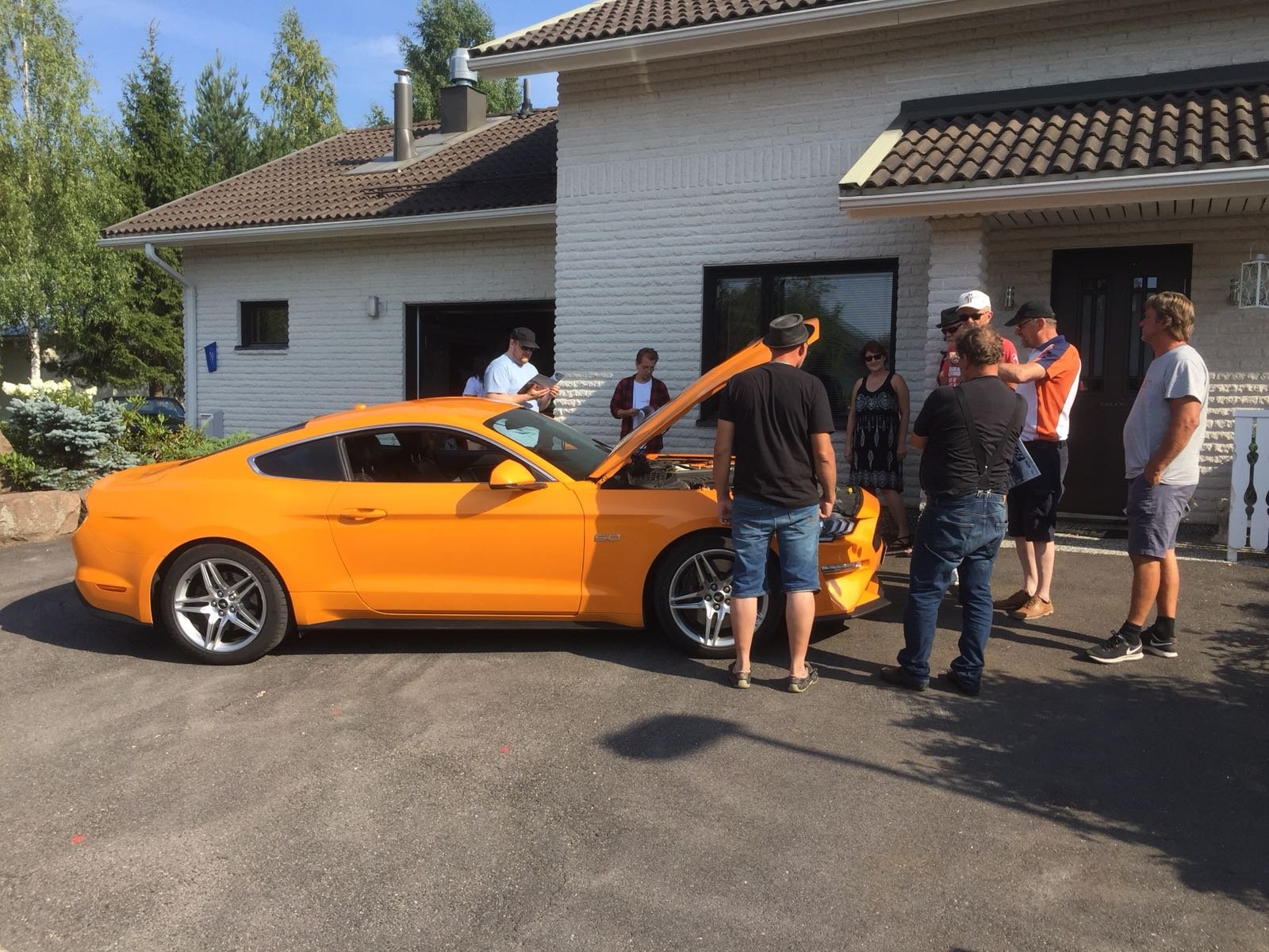 Oli se hieno vekotin.Keli helli ja Mustangeja tursui koko piha ja katu,ainakin kuusitoista.Iloisia ihmisiä ja varsin innokkaita koeajajia riitti.Juotava ja syötävä maistui.Kiitos Matille privaattiesittelystä.