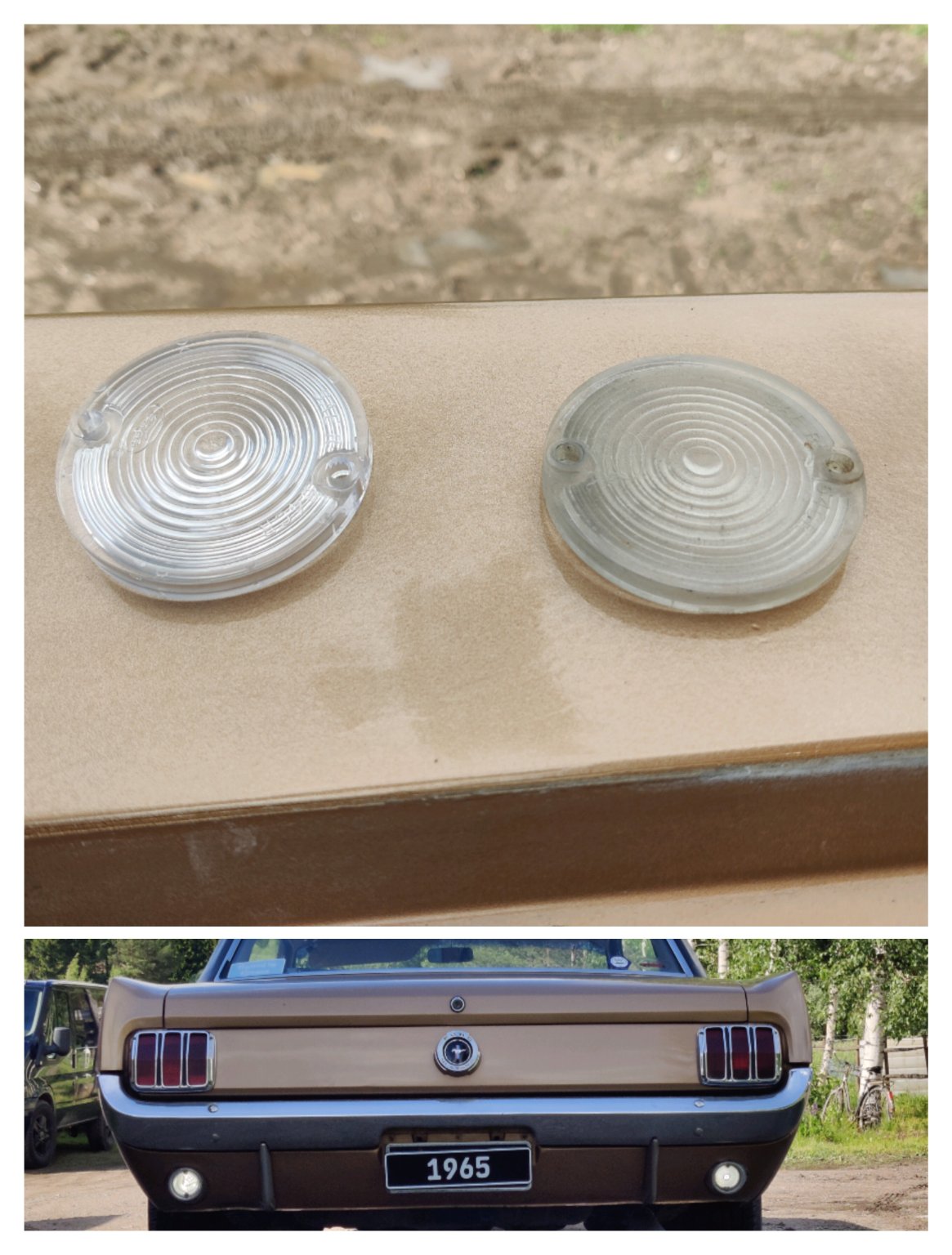Sain uudet linssit paikoilleen. Aikamoinen ero on linssin kirkkaudessa, mutta valotehossa eroa ei kirkkaalla säällä juuri näe. Kuvassa vasemmalla on uusi linssi sekä pelkkien linssien kuvassa että autokuvassa. Polttimoina on jotkut viiden watin ledit.