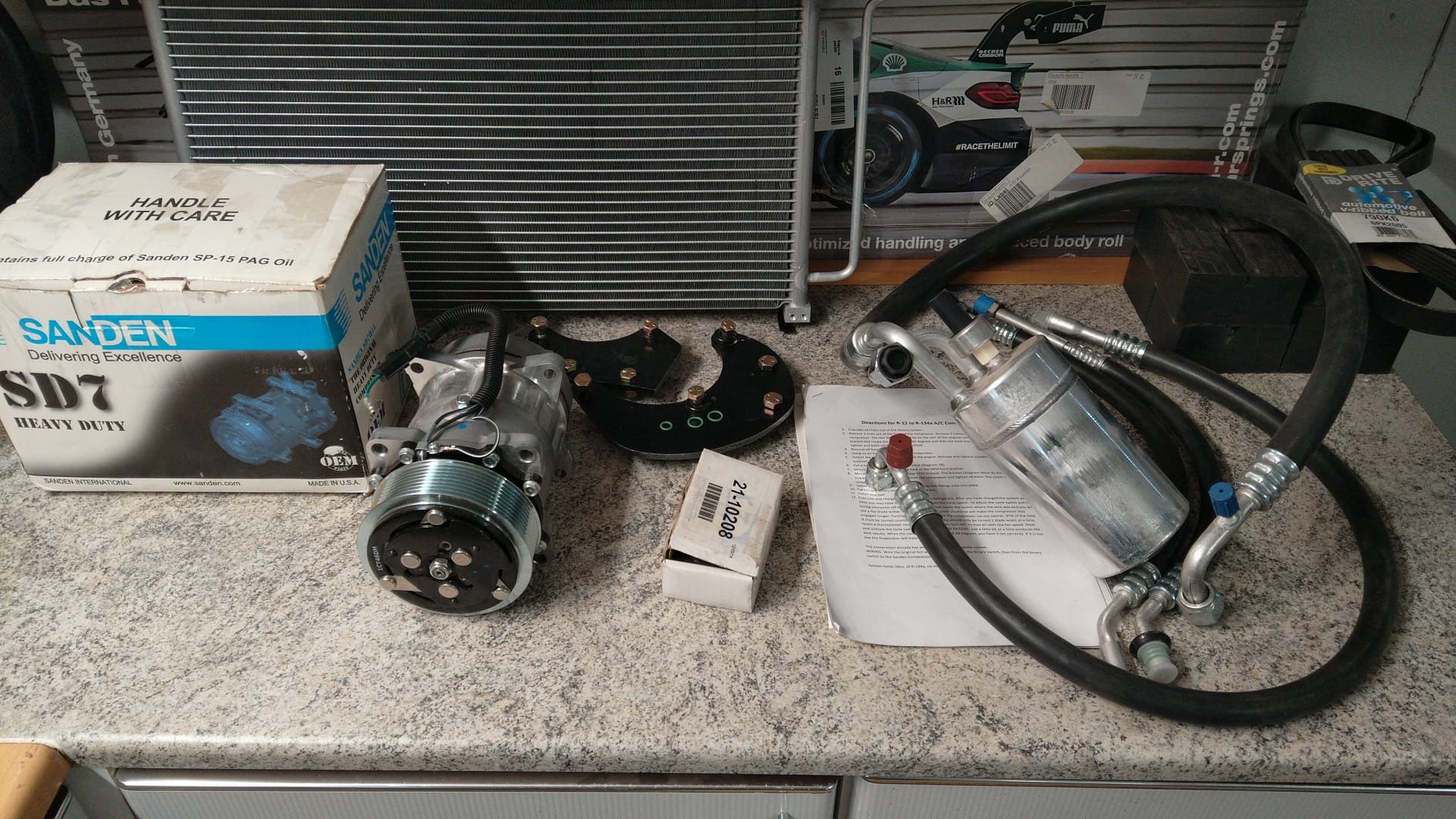 Niin se vaan Kuwaitin paketti tuli perille, kyllä, Kuwaitista. Hieman kyllä piti "googlettaa" toimittajaa ennen maksua mutta ei voi moittia palvelua. Vaikka nyt eroaa hieman edellisestä kuvasta niin uusia kiiltäviä osia 😎. Kompurassa on öljyt valmiina. LMR.comin conversion setti. Täällä vaan oli alessa -50%. Pakollisen ALVin kanssa noin 1400€ sis. rahdin (UPS), että tulihan tuota hintaa mutta vs. esim Luiginpajan täyttö korvaavalla aineella noin 500€ + vanhan vuotavan kompuran korjaus niin eipä nyt montaa sataa eroa jää.