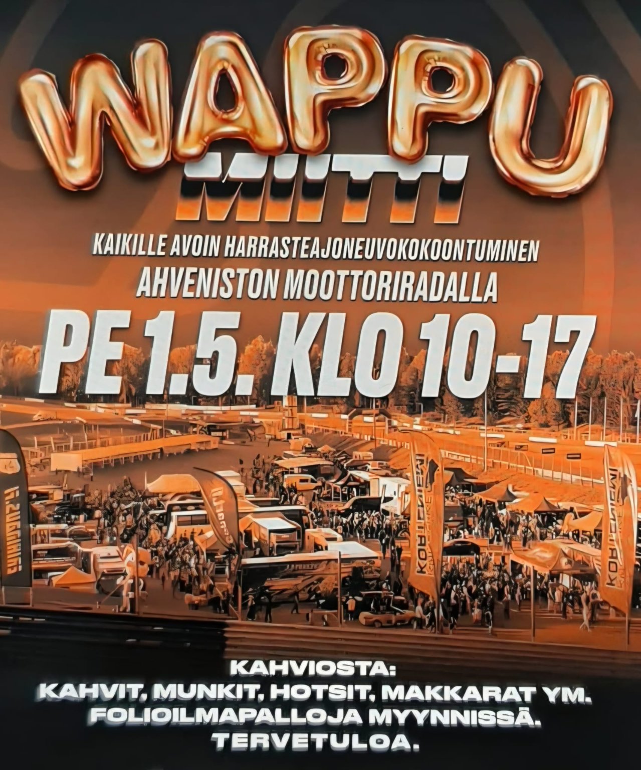 Harrasteparkki 30-vuotiaille autoille, lähdetään Karkkilasta klo 8:00 tai Keravan Huililta klo 8:15. Kokoonnutaan Mäntsälän Juustoportille klo 9:00, josta letkassa Lahteen.