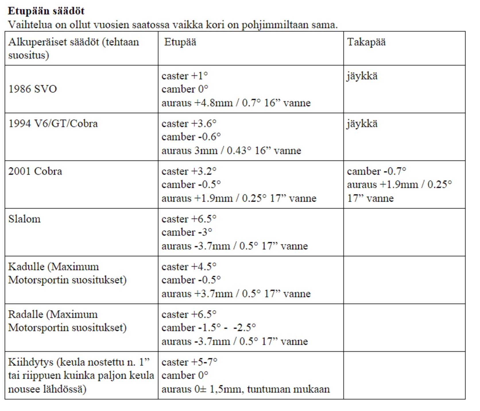 Aihetta voidaan jatkaa esim. hyviksi todetuilla säätöarvoilla. Kerro auton tiedot ja säätöarvot rengaspaineineen ja mihin lajiin säädetty (slalom, rata, drag, katu)