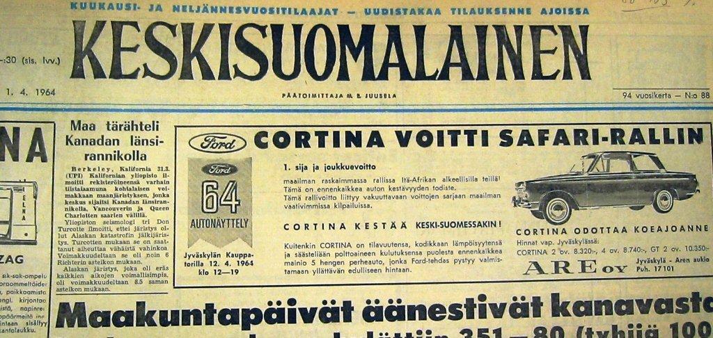 Tässä kolme kuvaa Keskisuomalaisessa julkaistuista mainoksista liittyen ARE OY:n autonäyttelyyn Jyväskylän Kauppatorilla sunnuntaina 12.4.1964. Kiitokset kuvista autohistorioitsija Timo Laitiselle Keravalle ja FFreakille niiden välittämisestä minulle.