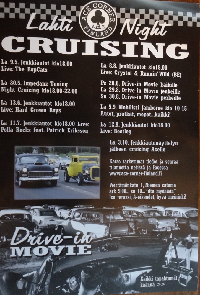 Lahti Cruising 12.9 lauantaina tuttuun tapaan Ace Cornerilla rannassa klo.18.00eteenpäin ja cruising lenkki n.klo.19.00,ken haluaa.Live musaa löytyy myös jälleen.Koko kesän ollut hyvin Mustangeja paikalla.