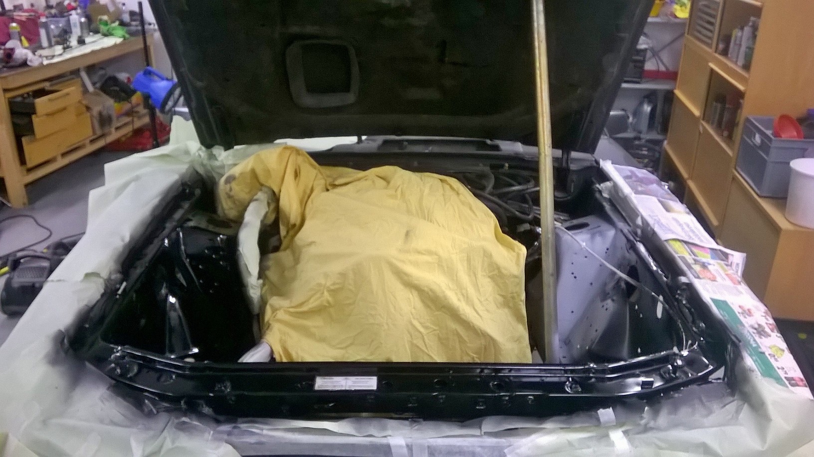 Foxin konehuone on alunperin periaatteessa auton ulkomaalin värinen. Mutta käytännössä maalauksen laatu ja peittävyys on sysisurkea ihan tehtaan toimesta, ainakin näissä omissa mustissa yksilöissä. Ohut kerros mustaa kiillotonta pintaväriä roiskaistu konehuoneen yläosiin ja tulipeltiin, valumia siellä täällä ja alempaa paistoi läpi vihreänharmaa pohjamaalaus (ja tietenkin ruoste...). Tässä kohtaa syyllistyin vakavaan "ylientisöintiin" ja maalasin koko konehuoneen ulkovärin mukaan mustalla peittäen kaiken pohjamaalin. Toisaalta en alkanut hipostelemaan millään erikoismaaleilla tai tarkkaan sävytetyllä. Maalasin pinnat alempaa puolikiiltävällä Motipin sprayllä ja näkyvät runkopalkeista ylöspäin Motipin kiiltävällä mustalla korjaus-sprayllä. Apurunko ja etuakseliston kilkkeethän kävivätkin teollisuusmaalamossa saaden kiiltävän mustan epoksin pintaansa. Kadehtien luin samaan aikaan ilmestynyttä Klassikot-lehteä kun siinä oli esittelyssä Fiat Uno, jonka punainen konehuone oli kaunis ja kiiltävä, ihan vaan orkkis maali vahaamalla kiillotettu.