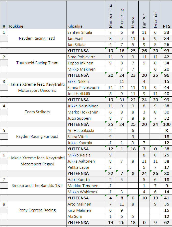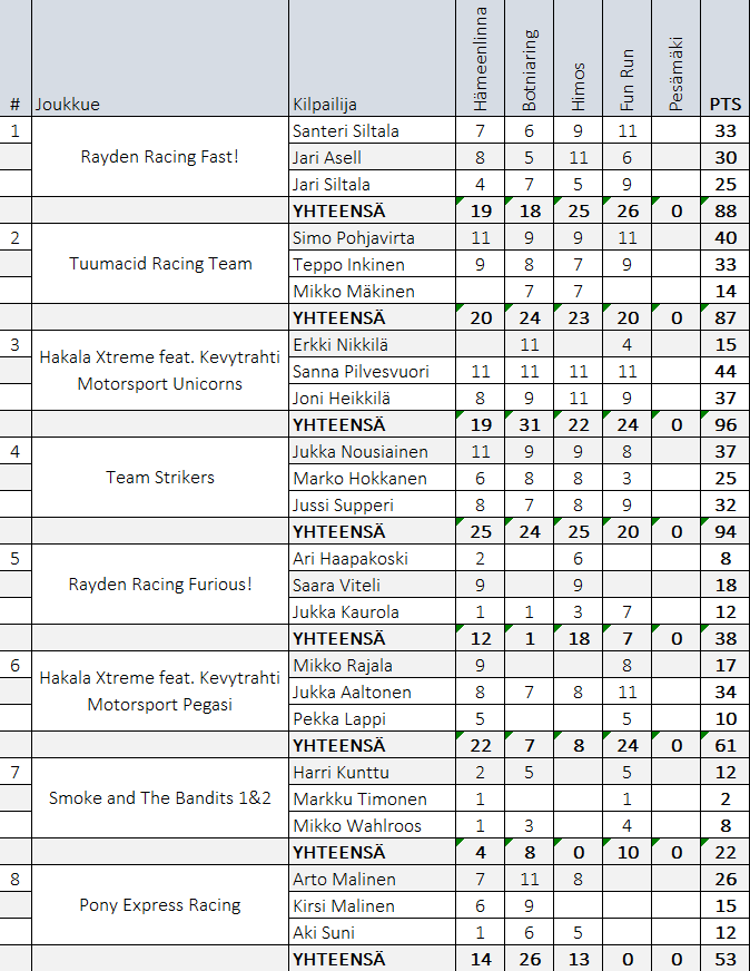 | Sija | Kilpailija ------------- | Hämeenlinna | Botniaring | Himos | Fun Run | Pesämäki | PISTEET | Virhesek |