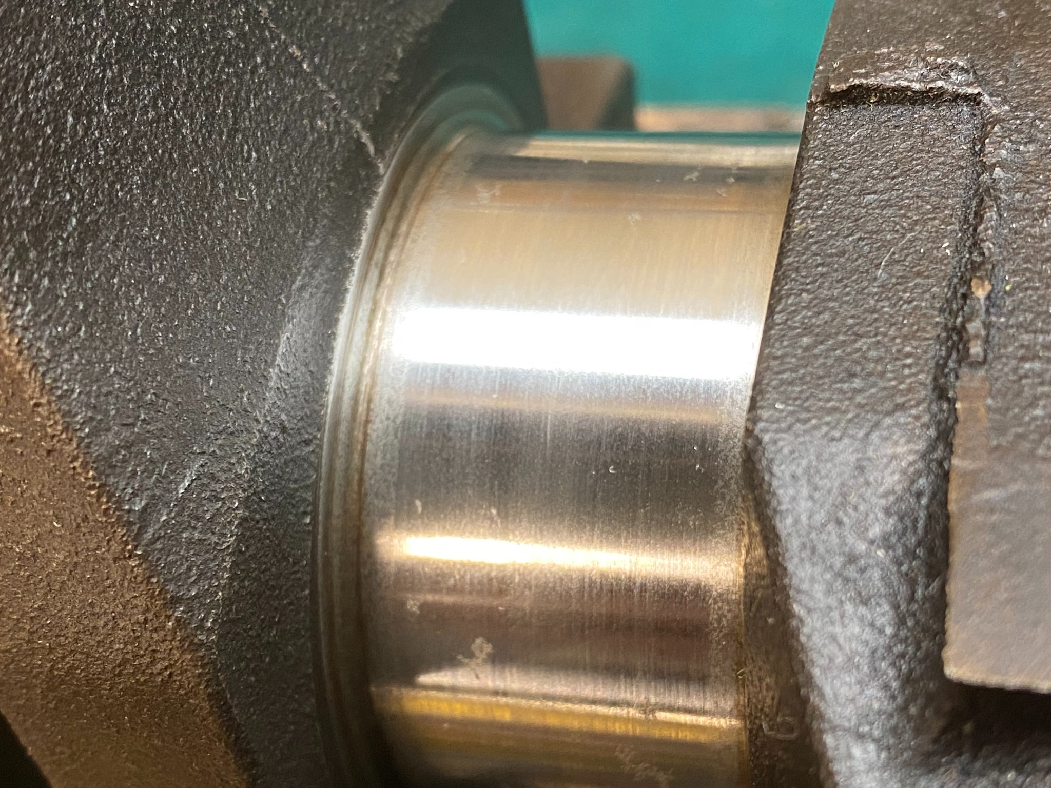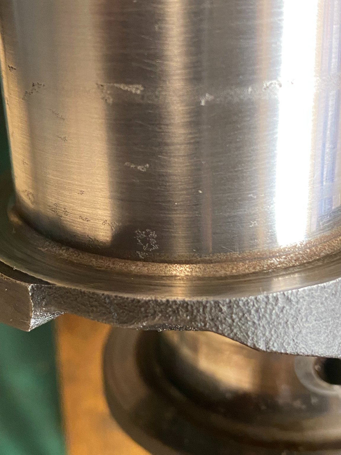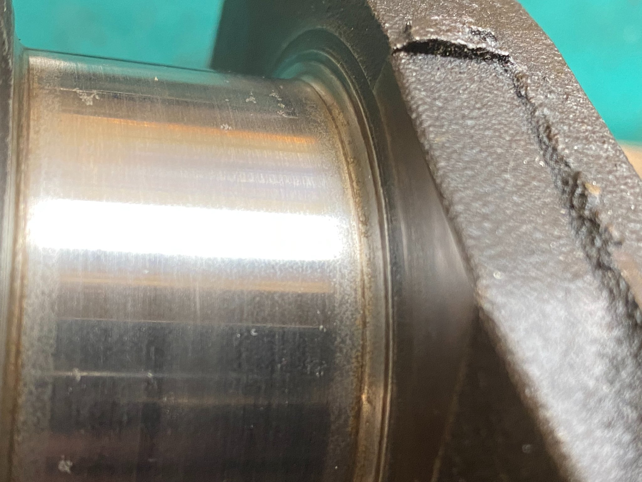 Mietittiin tuota vauriota, että kone on ehkä joskus käynyt heikolla öljynpaineella, laakeri hirttänyt kiinni, ja akseli kuumentunut reippaasti, jolloin tuo päittäisliukupinta on säröytynyt. Tämän jälkeen akseli on hiottu alikokoon, mutta päittäisliukupinnan säröt on sitten käytössä lähtenyt kasvamaan kaulan pyöristyssäteen viereen.
