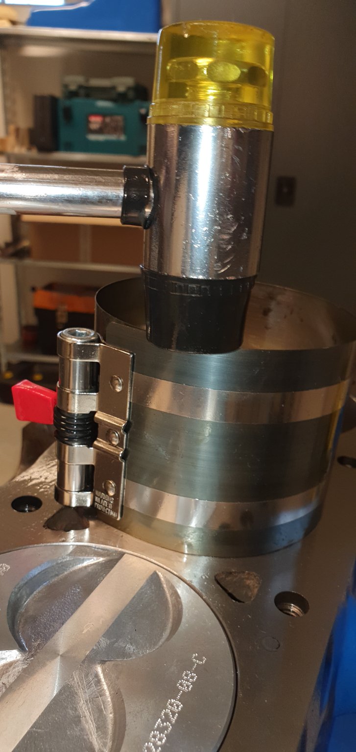 Hyvin onnistui asennus bilteman halppis puristimellakin, kun vaan naputteli puristimen suoraksi lohkoa vasten. Mäntien asennuksen jälkeen mittasin dekkikorkeudet. Matalin mäntä tulee -0.05mm dekin alle ja korkein tulee +0.10mm yli dekin, keskimäärin dekin ylitys on +0.05mm, eli aika tarkka nolladekki tuli. Hyvin onnistui niiden työstö, kun dekit joutui koneistaa hieman vinoon. Päätin tilata 0.041" paksuiset fel pro 1011-1 kannentiivisteet, joilla quenchiksi tulee sylinteristä riippuen 0.037-0.043".