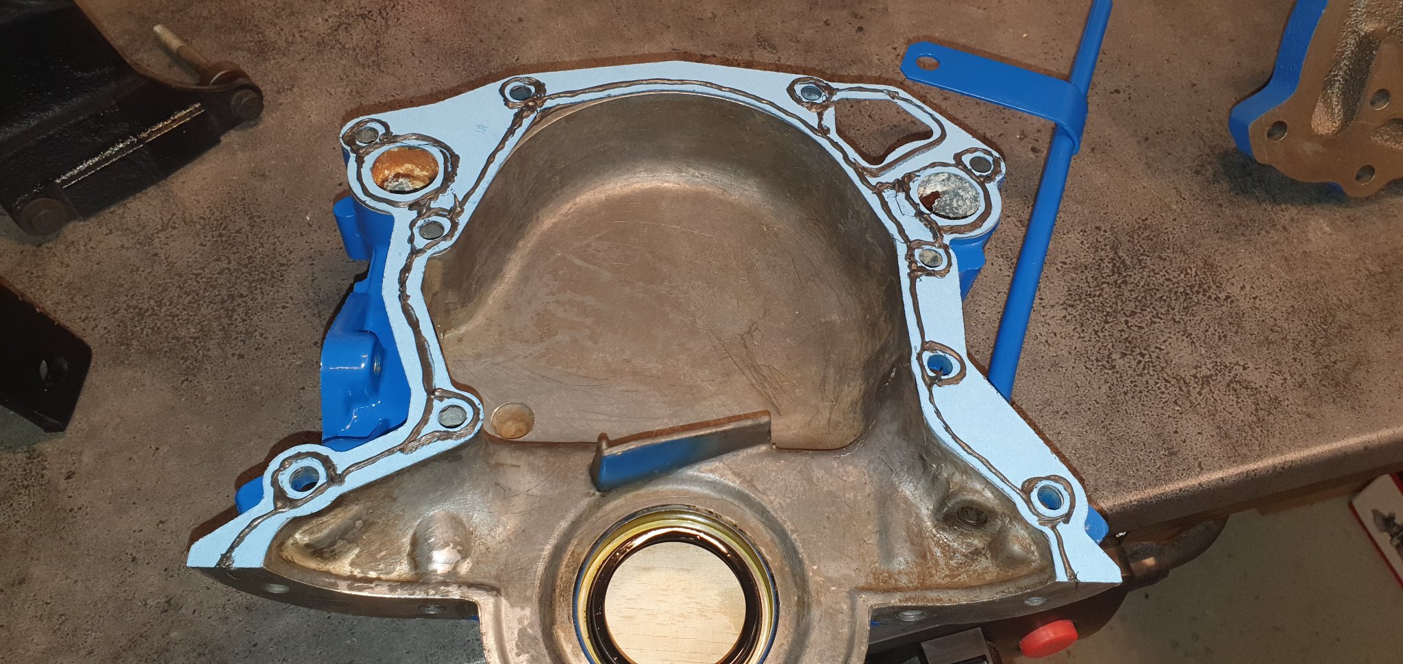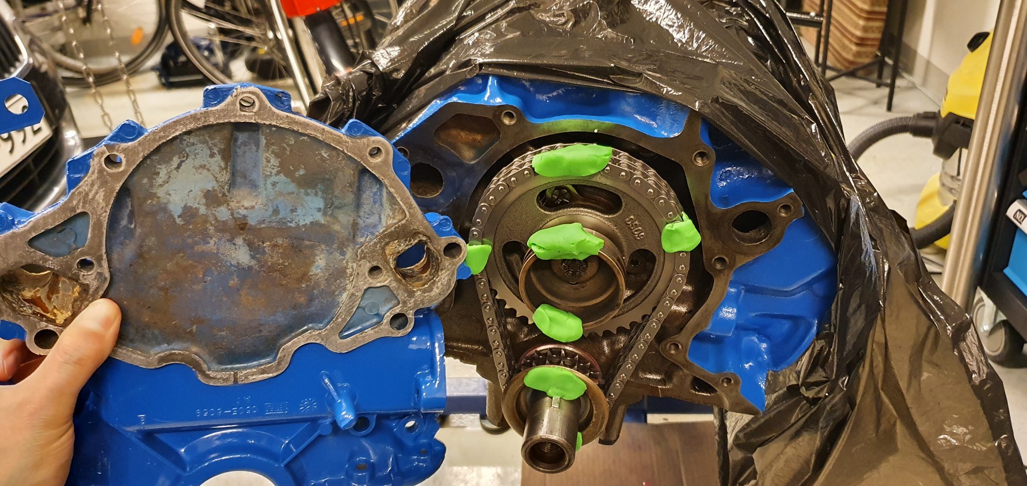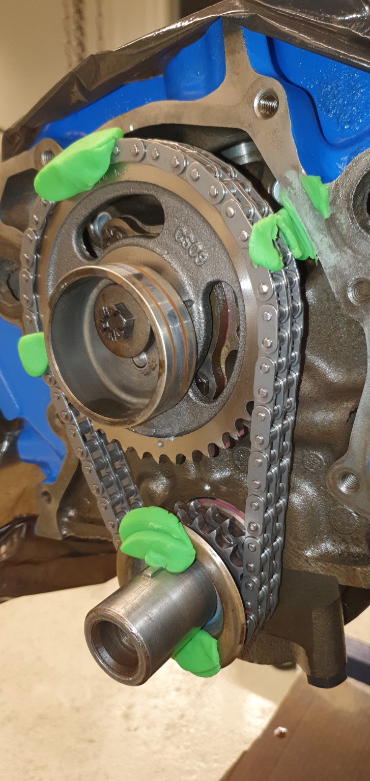 Uusi jakopää on vähän paksumpi kuin alkuperäinen joten koitin mittailla muovailuvahalla että jakopään koppaan jäisi riittävä etäisyys. Ketjun ja kopan välillä on hyvin tilaa, mutta alarattaan oil slingerin kohdalla väliä on n.3mm ja bensapumpun epäkeskon kohdalla n.2mm. Tiivisteen paksuuden verran tulee toki lisää välystä, ajattelisin sen riittävän.