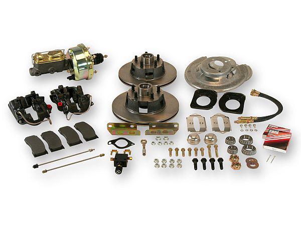 Drum to disc brake conversion kit with 4-piston cast iron calipers; non-power. Bolts to V8 drum brake spindles. Includes single bowl master cylinder.