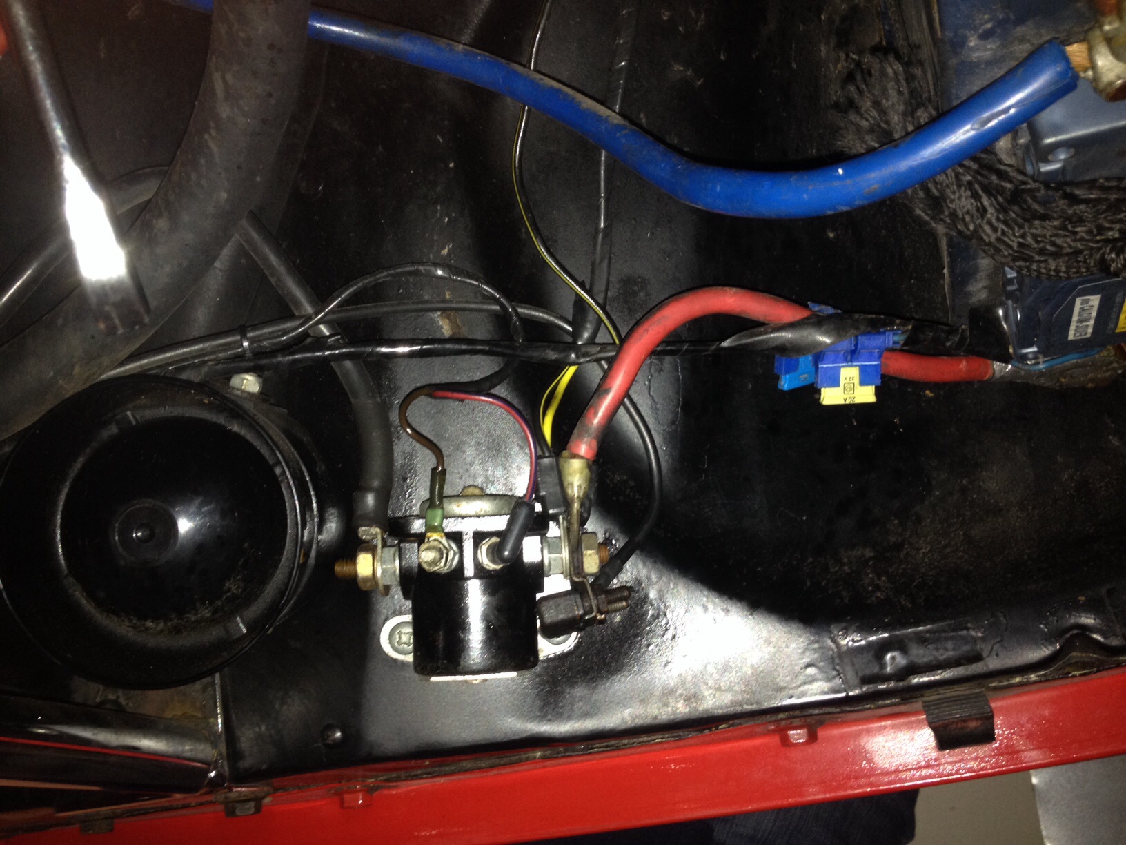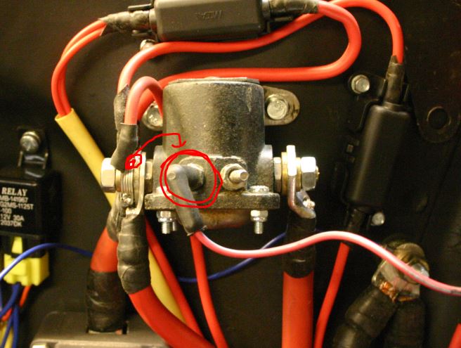 Ei tarvitse olla avaimen perässä ketään. Eli kun kytketään tuo pikkutappi tuohon vasemmanpuoleiseen isoon johtoon, niin solenoidin käämi saa virtaa ja vetää. Solenoidi yhdistää tällöin oikein toimiessaan vasemmanpuoleisen paksun johdon oikeanpuoleiseen paksuun johtooon, joka menee startille -> Startti saa virtaa ja pitäisi pyörittää moottoria.