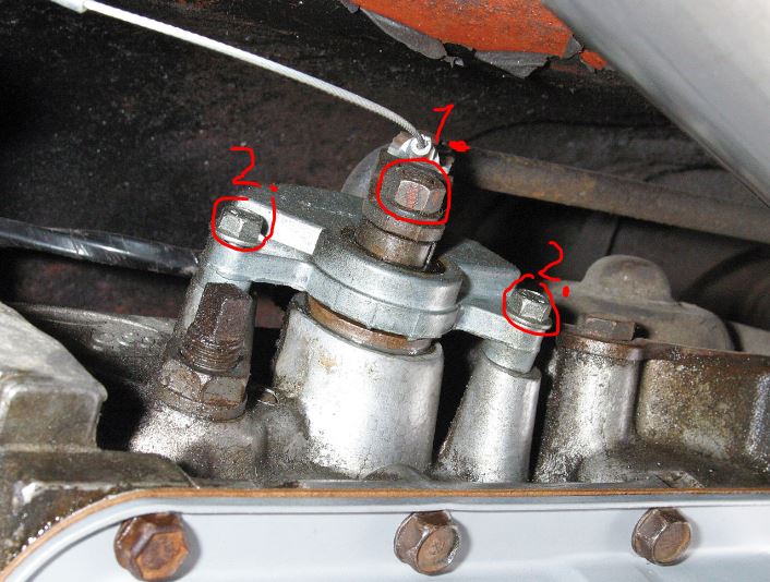 Jos vapaakytkin ei pelaa tai mittaus ei onnistu,niin saat koko kytkimen irroitettua avaamalla ensin yllä olevasta kuvasta mutterin 1, jolloin saat kick-down vivun pois ja seuraavaksi auki mutterit 2 ja kytkin irtoaa suoraan vetämällä.