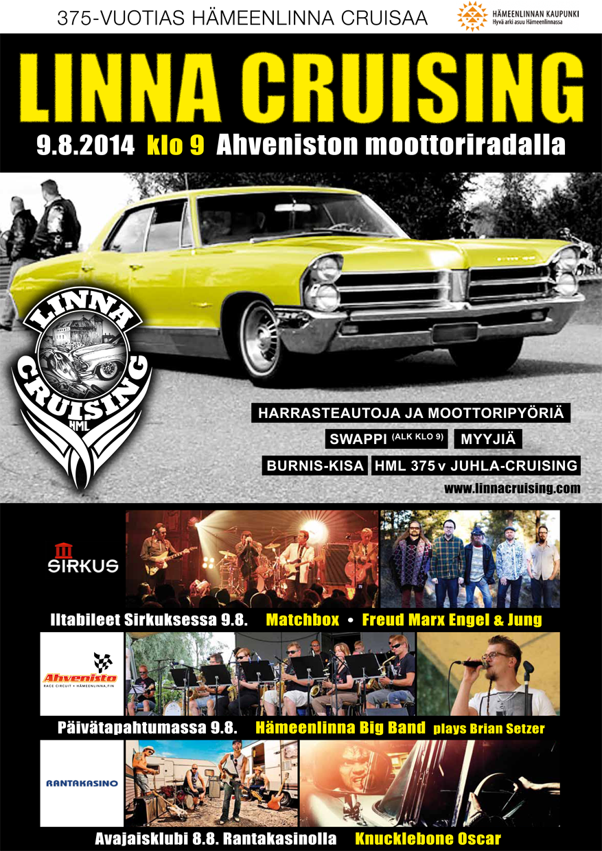 Täältähän ei löytynytkään ketjua Linna Cruisingille, joten avataan sellainen pikaisesti. Eli jos huomiselle ei ole vielä suunniteltu tekemistä, niin ei muuta kun nokka kohti Hämeenlinnaa ja Linna Cruisingia. Edellisiin tapahtumiin nähden paikka ja aika on muuttunut, eli tänävuonna tapahtuma on Hämeenlinnassa Ahveniston moottoriradalla ja tapahtuma alkaa jo aamulla 9.00 aikaan. Toki myöhemminkin paikalle voi saapua. Lisäksi cruising lenkki on uusi, vaikka meneekin suurimman osan matkasta samaa vanhaa reittiä pitkin. Samaan aikaan keskustassa on myös Elomessut, joten jos ennen on ollut katselioita tasaisesti koko reitillä, on niitä nyt varmasti keskustassa enemmän.
