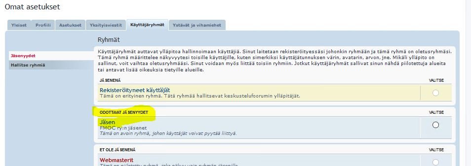 4. "Odottavat Jäsenyydet"-alla on nyt odottamassa ryhmän "Jäsen" hyväksyntä. Ylläpitäjät katsovat noin viikon kahden sisällä odottavat pyynnöt ja lisäävät jäsenyyden jos pyyntö pn asianmukainen (jäsennumero täytetty). HUOM. ylläpitäjät ilmoittavat "Jäsen"-ryhmään lisätyistä käyttäjistä tiedon jäsensihteerille. Jos tunnukselle ei kuulu jäsenoikeuksia, niin ne poistuvat automaattisesti ylläpitäjän toimesta kun jäsensihteeri ilmoittaa ongelmasta ko. tunnuksen jäsenoikeuksien suhteen. Saatat saada myös yksityisviestillä tiedon jäsenoikeusongelmasta.
