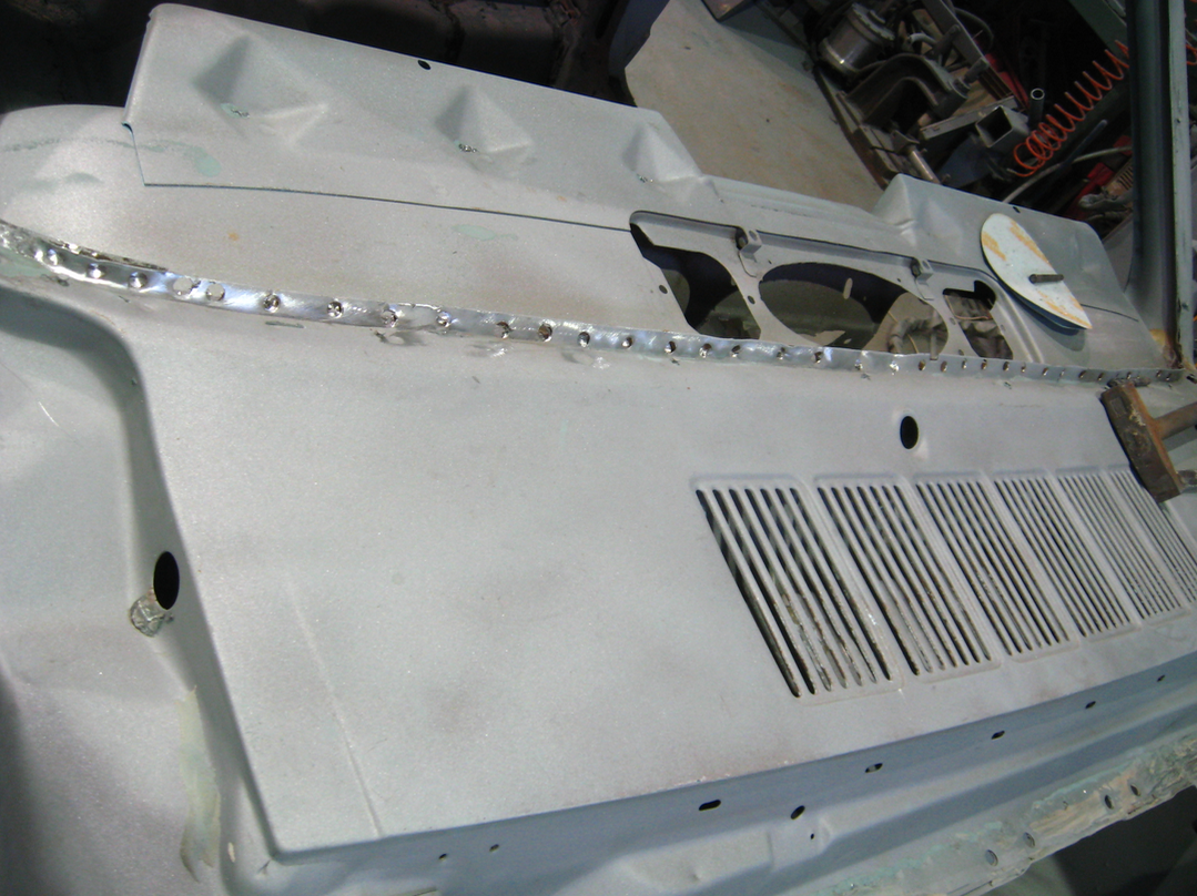 Eli yksinkertaisuudessaan homma meni näin. Lasi irti -> poraamalla pistehitsit auki -> kansi pois -> sitten pehmeät pois ja korjauspalat tilalle -> maalaus ja kansi takaisin päälle -> ja sitten kun auto maalattiin niin ritilästä suihkittiin vielä vähän väriä tuonne lisää.
