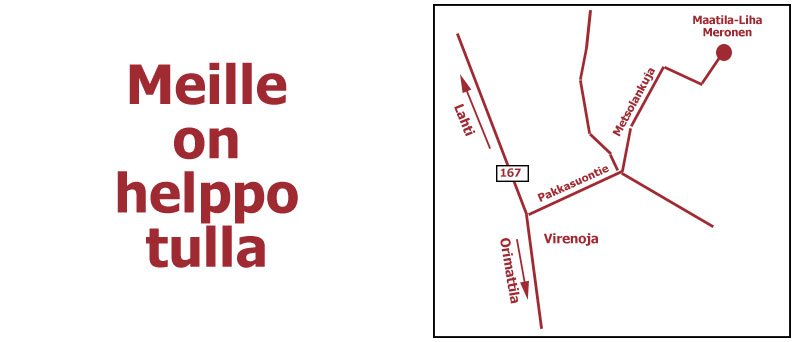 Olemme orimattilalainen perheyritys ja tarjoamme Sinulle maistuvaa lähiseudun lihaa sen eri muodoissa. Idyllinen maatilamme puoti sijaitsee Orimattilan Virenojalla vanhassa navettarakennuksessa Juha ja Erja Merosen pihapiirissä. Nykyaikaiset tuotantotilamme valmistuivat Lahden Sopenkorpeen vuoden 2012 alussa.