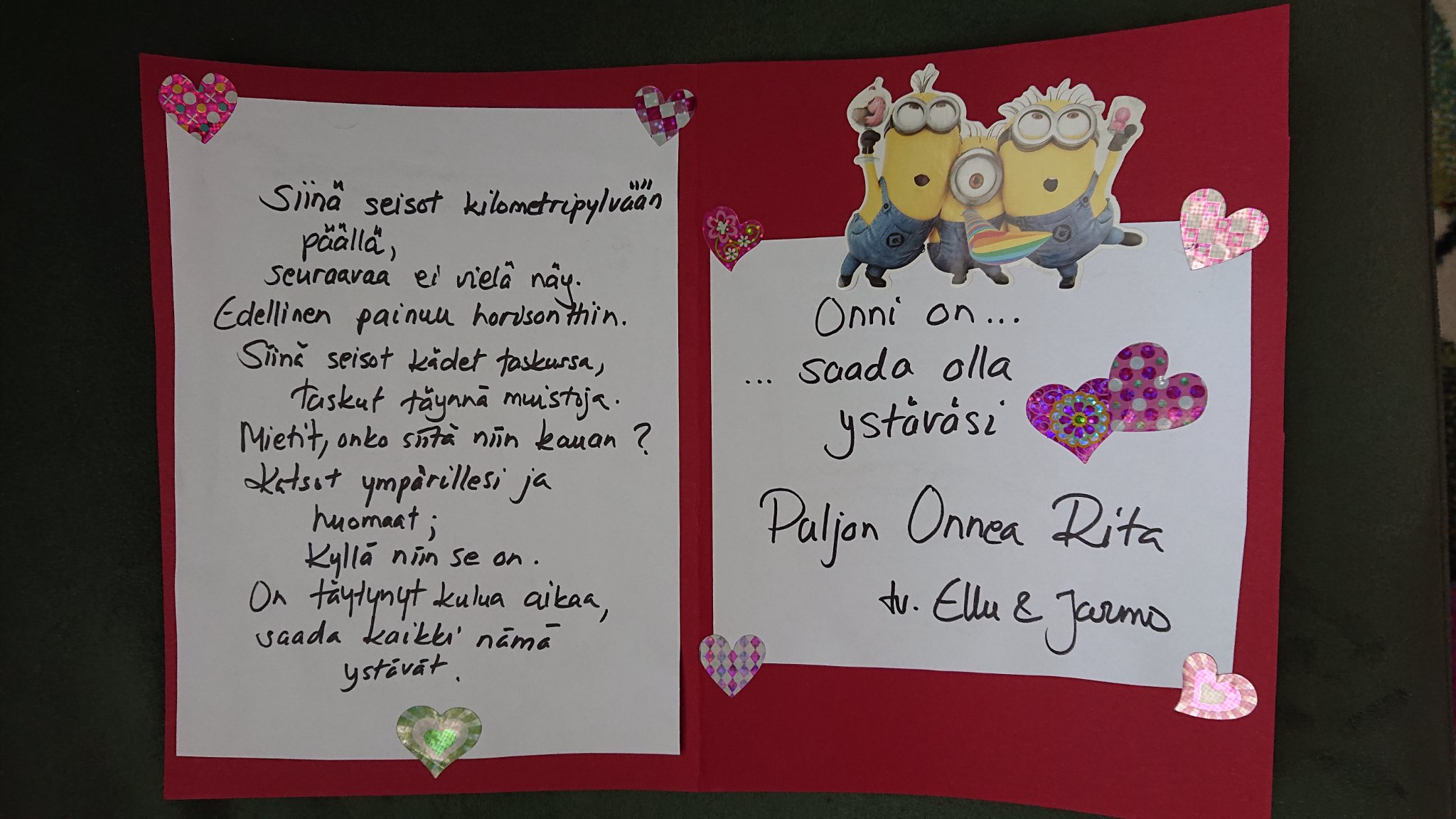 Ystävän kortti kertoo ajatukseni, puolestani. Rita