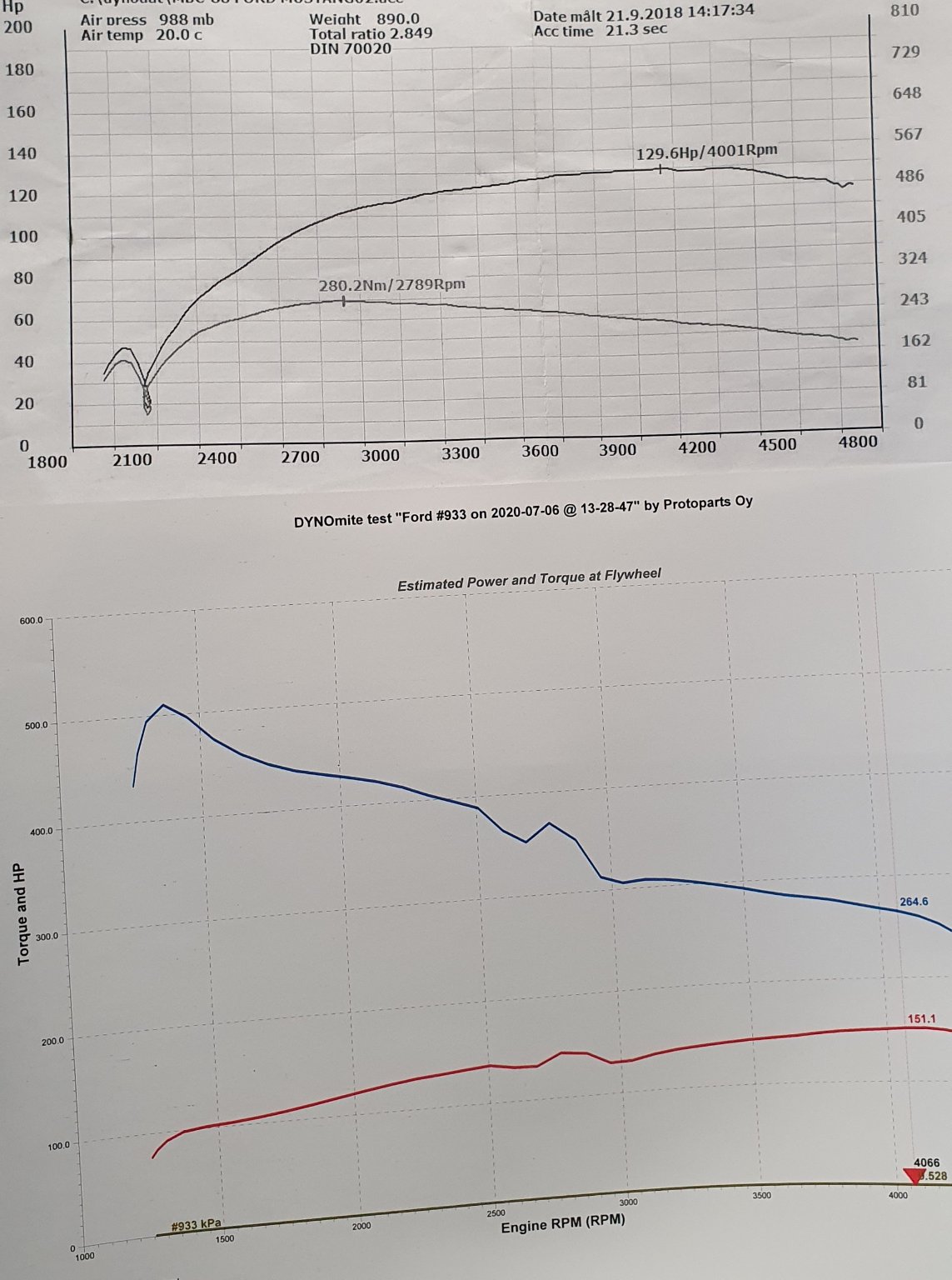 Molempien dynomittausten käyrät liitteenä. Alemmassa käyrässä vasta yli 3000rpm tulokset on jokseenkin käyttökelpoisia. Ajoin itse rullilla ekaa kertaa ja laatikko tietysti vaihtoi pienempää pykälää silmään ja turbiinistakin tuli jotain luistoa, joten siksi alle 3000rpm vääntökäyrä on mitä sattuu.