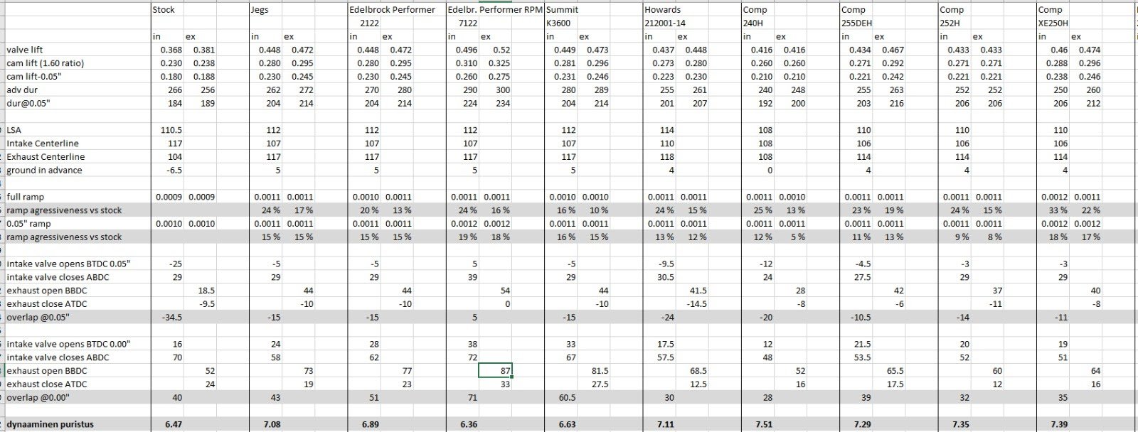 Mitä mieltä noista nokkavaihtoehdoista? Performer-nokista löytyy paljon kirjoitteluita ja kokemuksia, mutta tuosta Howardsista ei löydy juuri mitään. Howardsi on vähän miedompi, vähän jyrkemmät rampit ja suurempi LSA. Mitenkähän se mahtaa käyttäytyä verrattuna performeriin? RPM-range ainakin tuntuis hyvältä ja overlappia on vähän, mikä kaiketi parantaa hyötysuhdetta ja dynaamista puristusta.